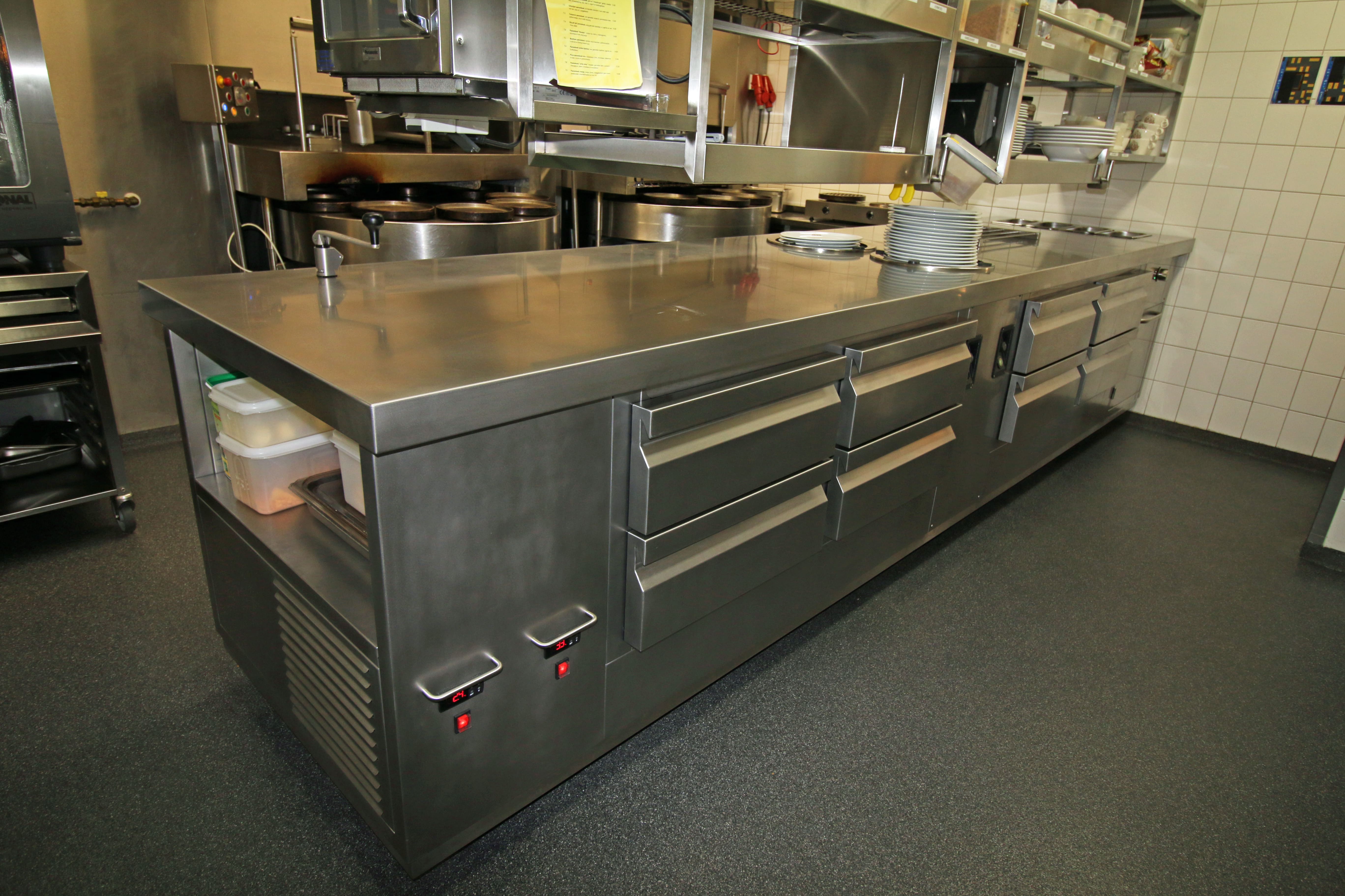 Naast innovatieve koellades is het meubel voorzien van inliggende handgrepen, 150 mm diepe koelbakken, een ingebouwde borden lowerator, een ingebouwde au bain marie en een volledig naadloos bovenblad.